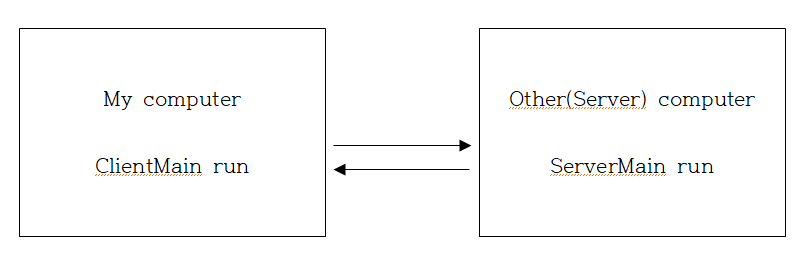 두 개의 컴퓨터를 바탕으로 내 computer에는 ClientMain을 실행하고, 또 다른 컴퓨터에서는 ServerMain을 실행해서 서로 어떻게 동작하는 것인지 테스트를 하려고 하는 것이 지금은 불가능하다. 그래서 일단은 같은 컴퓨터 내에서 테스트 할 것이고, 그것을 server라고 생각할 것이다.