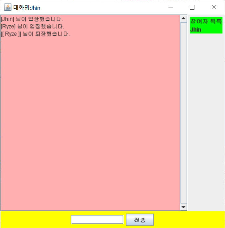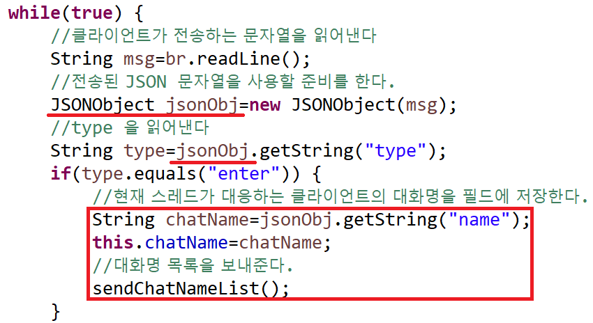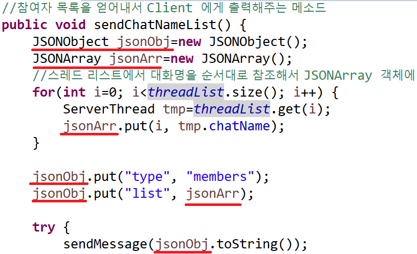 이전 예제에 더해서 대화방 참여자의 이름을 보이게 하고 싶은 것이다. 그래서 Server에서는 client로부터 날아오는 JSON Object를 받아 해당 내용 중에 이름을 받아 ServerThread 객체의 field에 저장하고, 그 각 객체의 이름들을 받아 JSON Object의 list에 담아 sendMessage( ) method를 이용해서 client로 내보낸다.