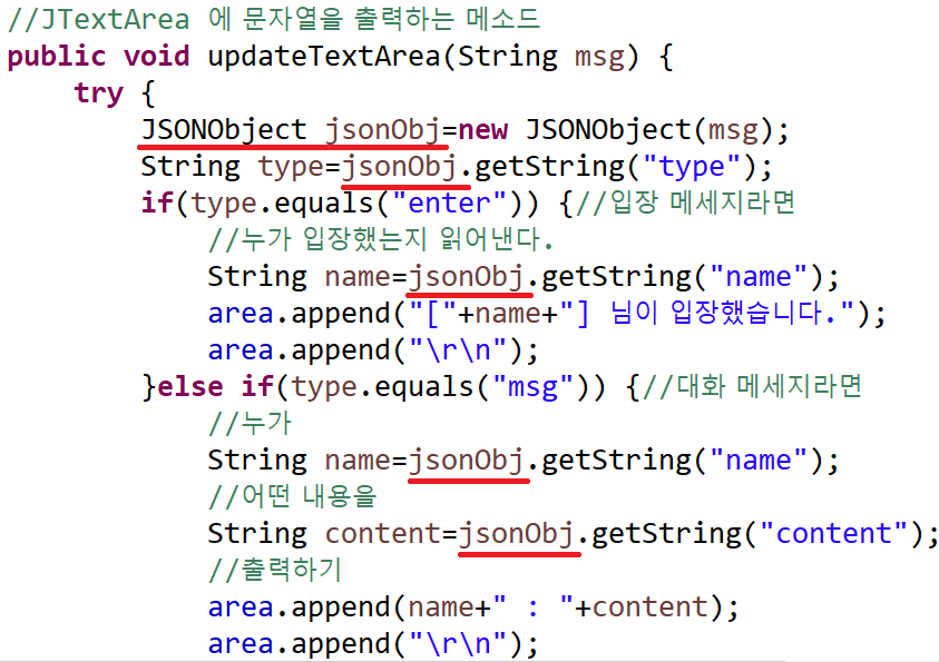 마지막으로 GUI를 업데이트 하기 위한 method이다. 전달받는 JSON Object의 type이 어떤 것인지에 따라 다르게 동작하도록 설계한 것이다. 여기에서 Vector 라는 친구는 List를 implements 한 것으로, 기능이 좀 더 많아서 좀 더 무겁다고 한다.