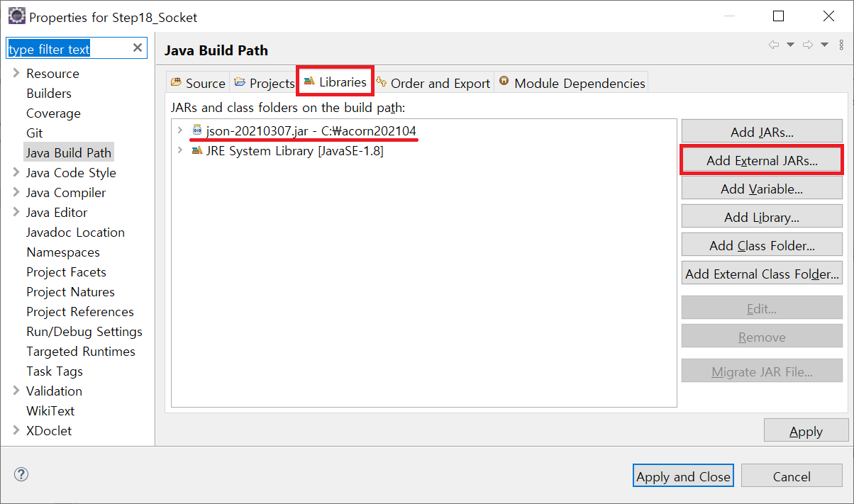 Libraries tab에서 Add External JARs 를 클릭하면 파일을 선택할 수 있는데, 다운로드한 json 파일을 선택하고 apply하면, 프로젝트에 json 파일이 추가된 것을 확인할 수 있다.