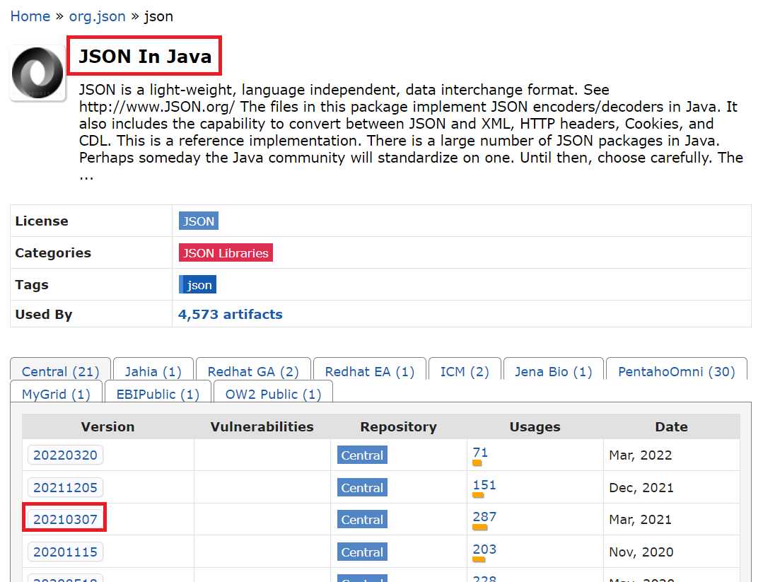 우선 이번 챕터를 시작하기에 앞서 MVN repository 홈페이지에서 json을 다운로드 한다. 당시를 기준으로 최신 버전이었던 20210307 에 해당하는 것을 다운로드한다. 1