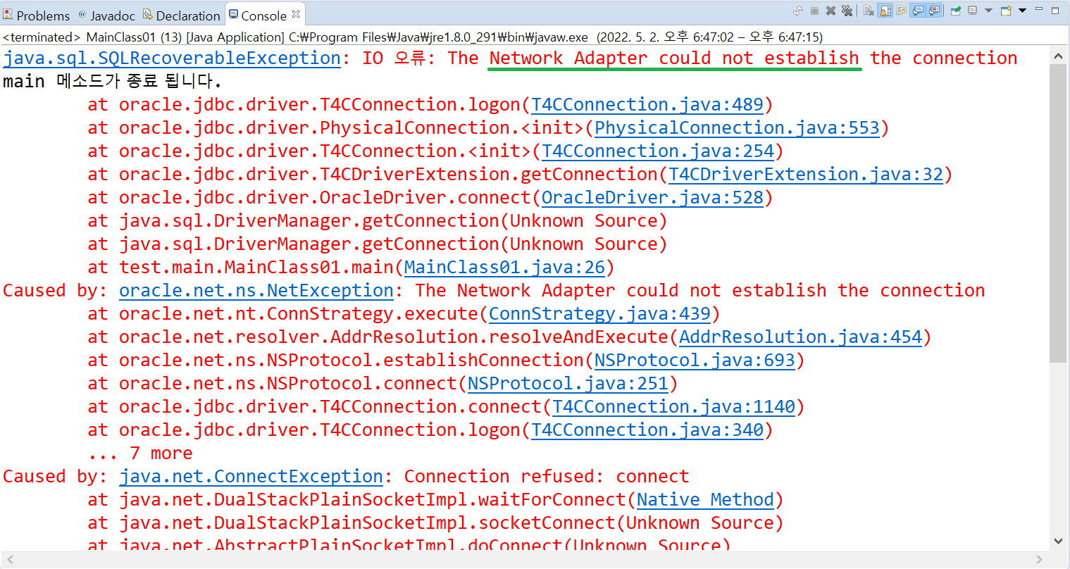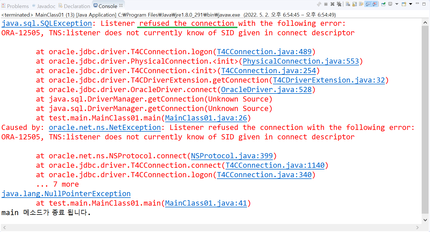 오른쪽의 exception은 연결하려고 하는 oracle DB의 ip 주소, port 번호, DB 이름, oracle 계정 정보가 올바르지 않을 때 발생한다. 이럴 경우는 Connection 객체가 정상적으로 생성되지 않는다.