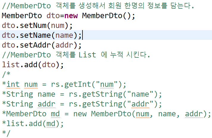 // 이름과 주소를 MemberDto 객체에 저장하기