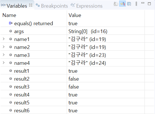 그래서 string의 경우 동등 비교 연산자를 사용하면 안되고 대신에 method를 이용하는데, 그것이 바로 equals( ) method이다.
