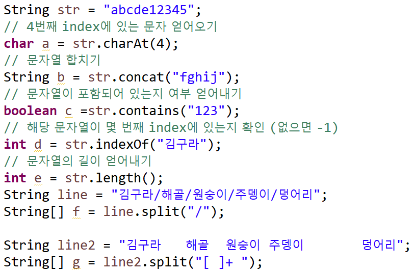 또다른 String type method를 알아본다. 우선 charAt(n)은 문자열의 n번 index에 해당하는 문자를 얻어온다. concat("xxx")은 기존 문자열에 이어서 붙여준다. contains("xxx")은 해당 문자열이 포함되어 있는지 여부를 boolean type으로 return 해준다. indexOf("xxx")는 해당 문자열이 몇 번째 index에 있는지를 return 해준다. 해당 문자열이 있다면 문자열의 가장 앞에 해당하는 index를 return 해주고, 없으면 -1을 return 해준다. length( )는 문자열의 길이를 알 수 있다. split("x")은 해당 문자열을 "x" 로 구분해서 String[ ] (스트링 배열) type으로 return 해준다. split( ) 에 들어가는 문자열은 정규 표현식을 구분하기 때문에 정규 표현식으로 작성해도 된다. replaceAll("xxx", "yyy")은 문자열의 "xxx" 를 모두 "yyy" 로 바꾼 결과로 return 해준다.