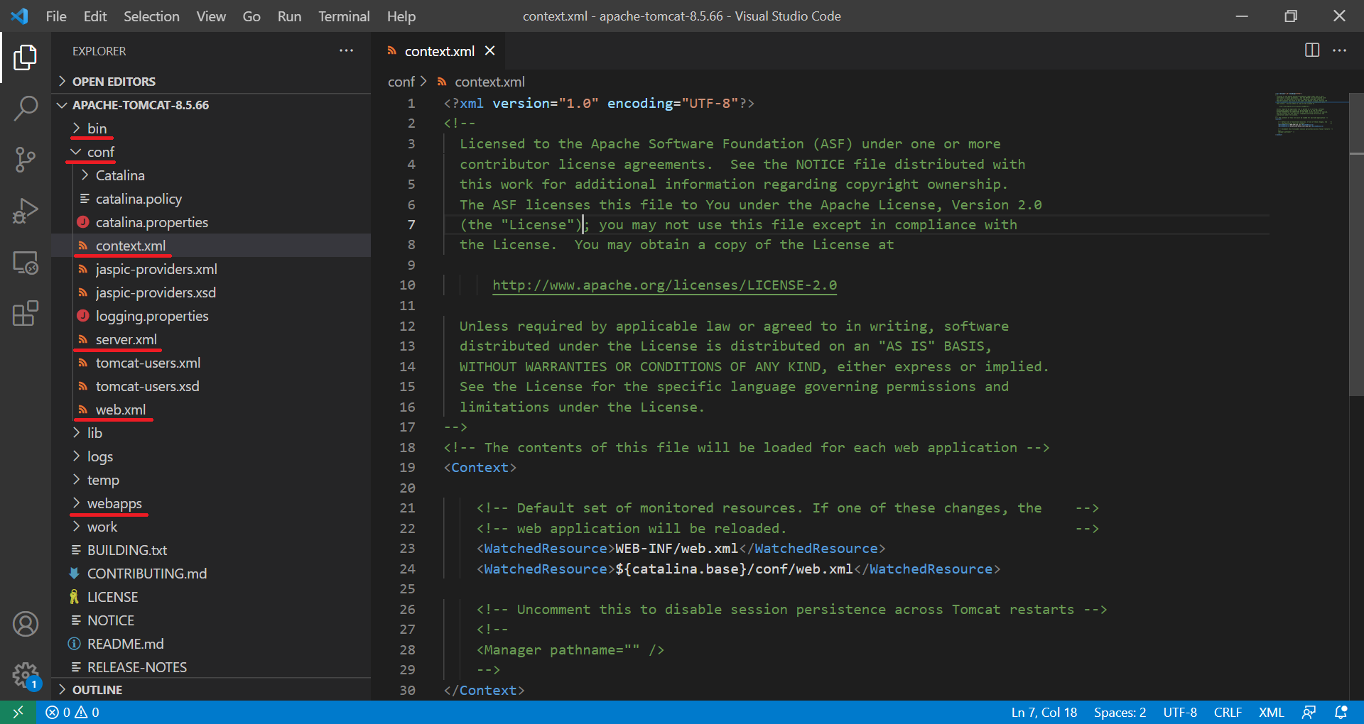 우선 visual studio code로 tomcat folder를 연다. bin folder는 실행 file들을, conf folder는 설정 file들을, webapps folder는 서비스 할 내용을 담고 있다. 이 중에 conf folder에 보면 .xml file 들이 보인다. 이 xml file은 뭘까?