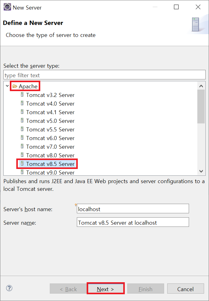 기본 설정을 마쳤다면 eclipse의 우상단에서 Java EE 를 선택하고(default라 없을리 없지만 없다면 상단 tab Window > Perspective > Open Perspective > Other 에서 찾아준다. 화면 하단의 Servers tab에서 우클릭 후 New > Server 를 클릭하면 다음의 단계를 거치게 된다.