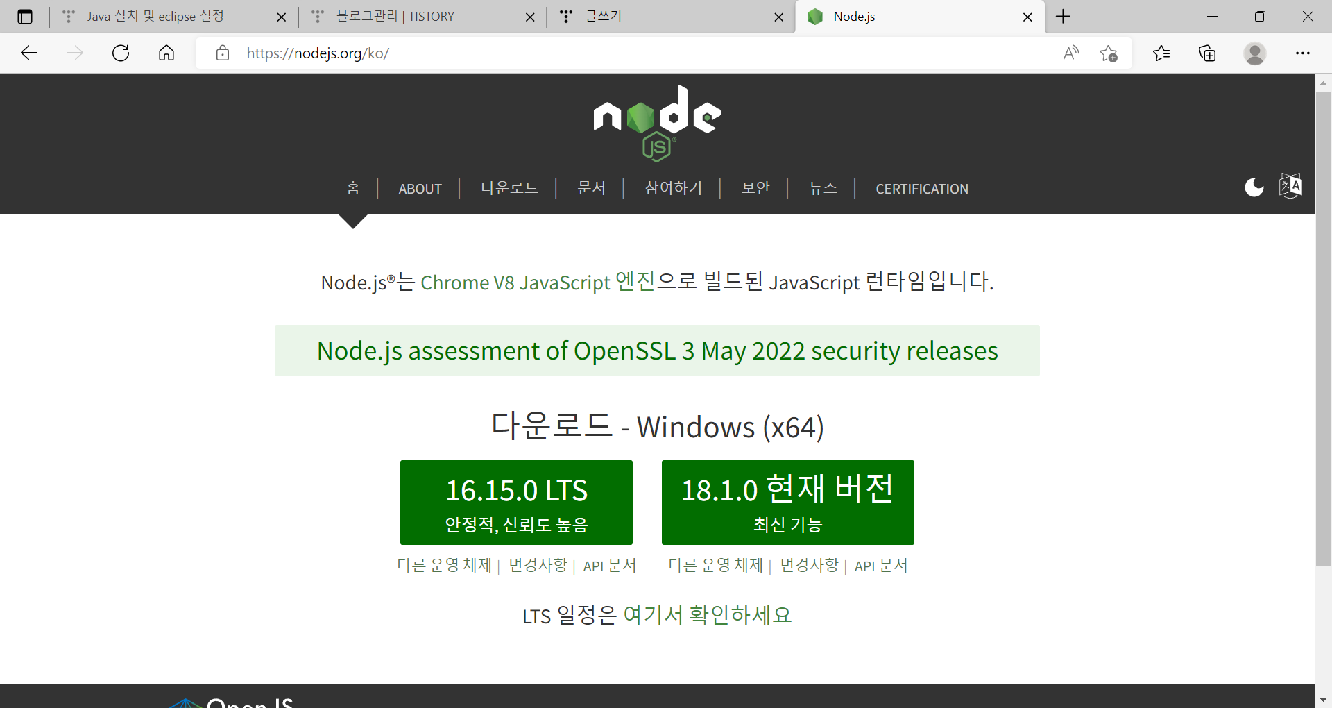 Eclipse가 node.js에 의존하고있기 때문에 설치한다. Node.js는 server side javascript이다. Node 홈페이지3에 접속해서 그냥 보이는 것을 설치했다. 당시는 14.17.0 버전이었으나 지금은 16.15.0 버전이다. 다운받아서 default로 설치해준다. 이렇게 설치하고 두는 것이지 우리가 사용하지는 않는다. Eclipse가 알아서 사용해준다. Shell에서 node를 작성하면 버전을 확인할 수 있다.