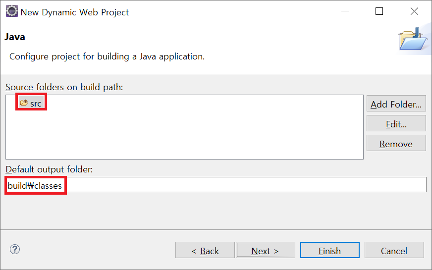 Hello라고 이름을 작성하고 Next를 누르면 src 위치가 공백일 것이다. 해당 내용을 src로 바꾸거나 지우고 src로 만들고하단의 Default output folder 위치에 build\classes 를 작성하고 Next를 누른다. Content directory에 WebContent 라고 작성하고 Finish를 한다.
