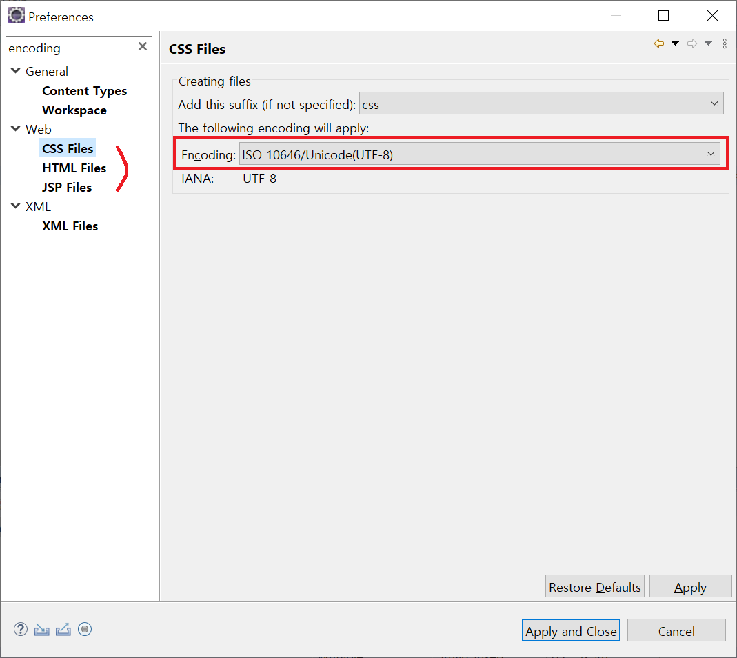 - 이어서 Web 항목에 있는 CSS Files, HTML Files, JSP Files를 각각 클릭해서 Encoding 정보를 ISO-10646/Unicode(UTF-8) 로 바꿔주고 적용한다.