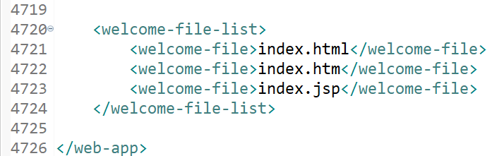 하지만 사람들은 project에 어떤 내용이 있는지 알 수 없다. 그렇기 때문에 어떤 주소를 요청해야할 지 알 수 없다는 것이다. 그래서 index page 라는 친구가 필요하다. 이 친구는 애플 홈페이지를 방문할 때 'apple.com' 만을 작성하는 것처럼 페이지를 방문했을 때 사용자를 가장 먼저 맞이하는 welcome page가 된다. 이 index page는 index.html 의 이름으로 작성해야 한다. 이름이 무조건 이래야하는데, 이에 대한 설정은 server를 추가할 때 만들어진 Servers 의 web.xml 4720번째 줄 가장 하단에 작성되어 있다. index.html file이 없으면 index.htm, 이것마저 없으면 index.jsp file을 찾아서 welcome page로 만든다. 전부 없다면 만들어지지 않는다.