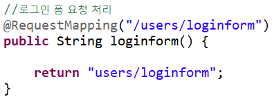 로그인 form이 있는 page를 요청하는 controller의 method이다. 왜 굳이 ModelAndView 객체를 전달받아야 했는지 모르겠다. 해당 controller method의 return type을 String으로 바꿔서 return 하고, method에 전달되는 매개 변수를 지웠다.