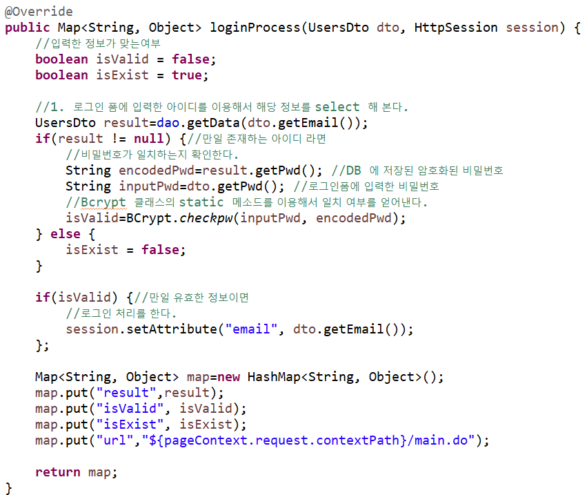회원 가입 요청에 대한 controller의 method 이다. Front 쪽 form의 required 속성을 사용해서 여러 에러 요소들을 열심히 막아두어서 그런지 몰라도 바로 Map 객체에 true 값을 넣어 return 했다. 혹시 모를 exception 이 발생하면 어차피 이 단계까지 오지도 않겠지만, 이렇게 바로 true 값을 넣기보다 service 단에서 중간에 check 하는 단계가 하나 들어갔으면 좋지 않았을까 싶다. 그리고 어차피 map을 return 해줄 것이었다면 이미 service 단에서 완성하는 편이 더 나았을 것이다.