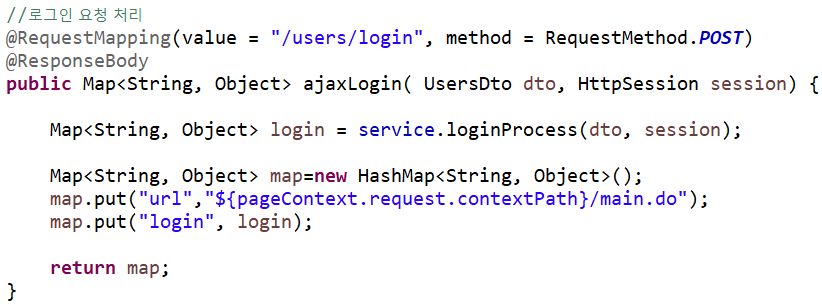 Map 으로 return한 것을 굳이 또 새로 Map을 만들어서 그 안에 넣을 필요는 없다. Map은 하나로 통일시키면서 왜 ajax 방식의 login인지를 살펴보기 위해 front 쪽을 살펴보았다.