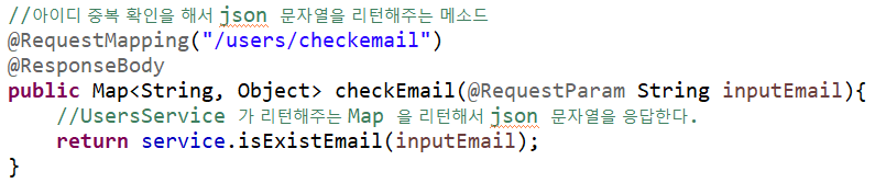 회원 가입에서 email 중복 확인 check를 위한 controller의 method이다. Email을 회원 가입 form에서 작성하면, 작성과 동시에 ajax로 해당 경로 요청에 대해 Map 객체를 return 하고 있었다. 이 내용 자체에는 문제가 없고, 해당 요청을 loginform.jsp 의 이상한 곳에서 요청하고 있는 것을 발견했다. 해당 내용은 다음 다음의 login에 작성하겠다.
