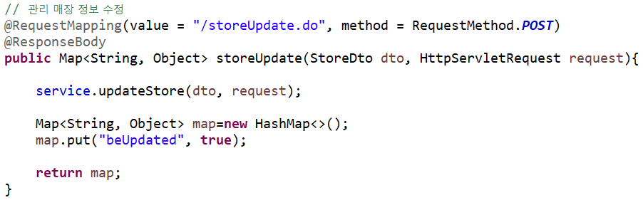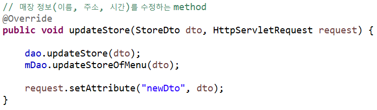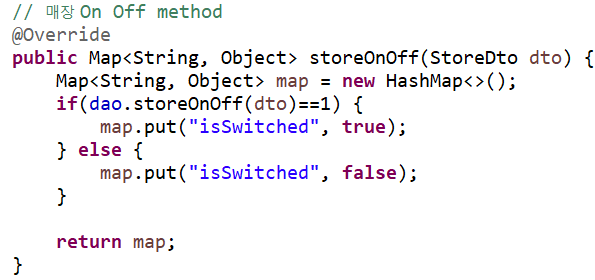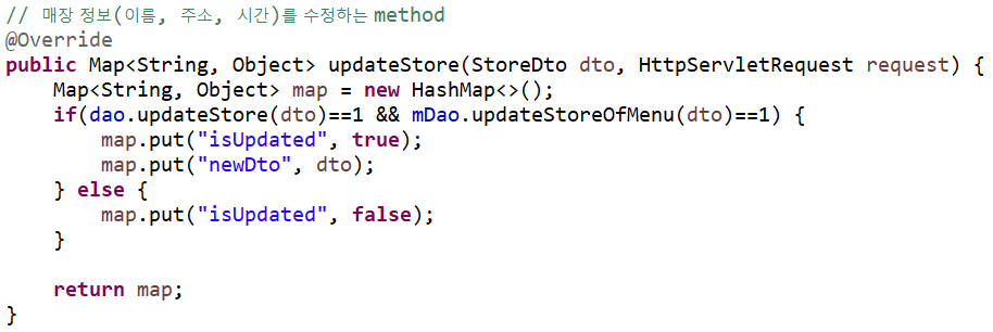 Map 을 service 단에서 처리하는 것은 어려운 일이 아니지만, 의외로 메뉴에 대한 내용을 update 하는 dao method가 있어서 당황했다. 이또한 DB 설계에서의 문제였다. DB의 메뉴 table을 확인해보면 매장의 이름에 대한 column이 존재한다. 당시 필자가 SQL문을 잘 작성하지 못해서 대안으로 DB을 변경하면서까지 오류 없는 기능 수행에만 집중했었는데, 이런 중복은 피하는 것이 좋을 것 같다. 필자가 잘못한 것이다. 일단 query 문으로 인한 update 문이 수행되었는지의 여부에 따라 다른 response를 위해 Map 객체를 service 단으로 가져와서 분기했다.