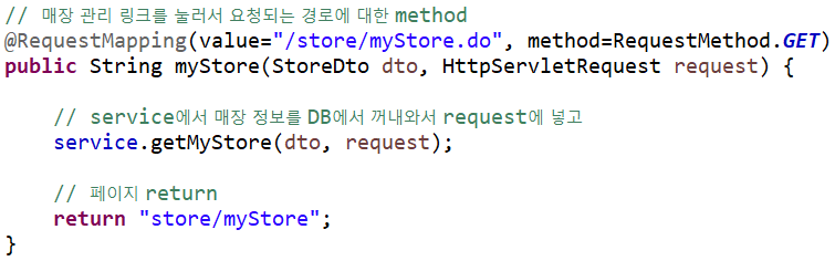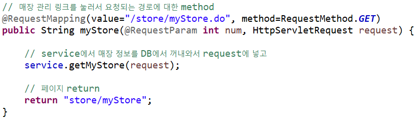 매장 정보 관리 페이지 요청에 대한 controller의 method이다. 별 문제 없어보이지만 문제가 있다. Service logic으로 들어가보면 Request parameter를 받았음에도 사용하지 않고 있는데, 애초에 request scope에서 가져올 수 있는 내용이기때문에 중복되므로 지워주었다.