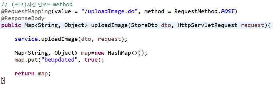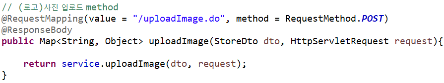 매장에 대해 간단히 보일 수 있는 로고 및 기타 이미지를 올릴 수 있는 controller의 method 이다. 여기에서 또한 Map 객체를 service 단에서 다루고 싶다.