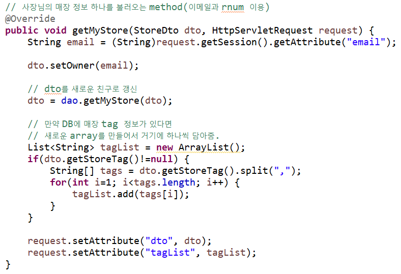 개발때부터 계속 걸리던 부분 중에 하나가 service의 getMyStore_num method 이다. Email과 번호로 DB의 매장 정보를 불러오는 method와, email이 없이 번호만을 이용해서 DB의 매장 정보를 불러오는 method로 나눈 것이다. 여기에서는 구조 상 email 정보를 필요로 하는 method가 되는 것이 맞다고 생각해서 Request 객체를 추가로 전달해서 email 정보를 받은 후, 다른 Dao method를 사용하는 것으로 바꿔주었다. 그리고 DB query 문 성공 여부에 따라 response를 달리할 수 있도록 Map 객체를 controller에서 service로 들여오면서 바꿔주었다.
