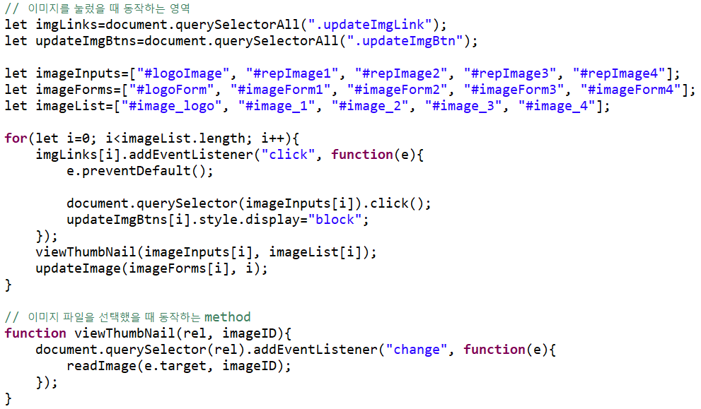 마이페이지에서 프로필 이미지를 upload 하는 것과는 다른 logic이다. 필자는 이미지를 보이게 하는 것과 동시에 upload가 수행되는 것이 마음에 들지 않았다. 그래서 따로 썸네일을 바로 보이게 할 수 있는 logic을 검색해서 찾아 적용했다. 이미지를 선택해서 해당 element에 change가 발생하면 이미지를 읽어올 수 있도록 한 것이다. Change가 발생한, 즉 event가 발생한 target에 files 에는 해당 file에 대한 정보가 담겨있다. 그래서 file을 FileReader 객체로 읽어서 이미지가 load 되었을 때, 이미지를 보일 element의 src에 이미지의 정보가 담긴 target의 result 정보를 넣어준 것이다.