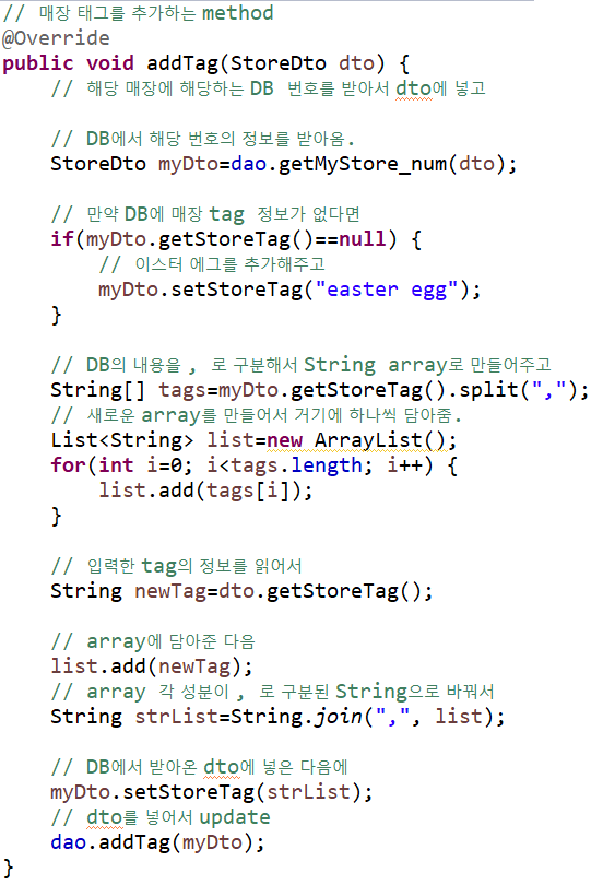 사실 'easter egg' 라는 친구는 null pointer exception 때문에 project 기간 당시에 넣었던 기억이 난다. 여러 단계를 거치던 중, 처음 DB에 매장 정보가 생성될 때, front 단에 등장하지 않는 tag 정보를 하나 넣어주는 것으로 오류를 잡으려는 것으로 마무리했던 것 같다. 그래서 tag 관련 if문을 지워주었다.