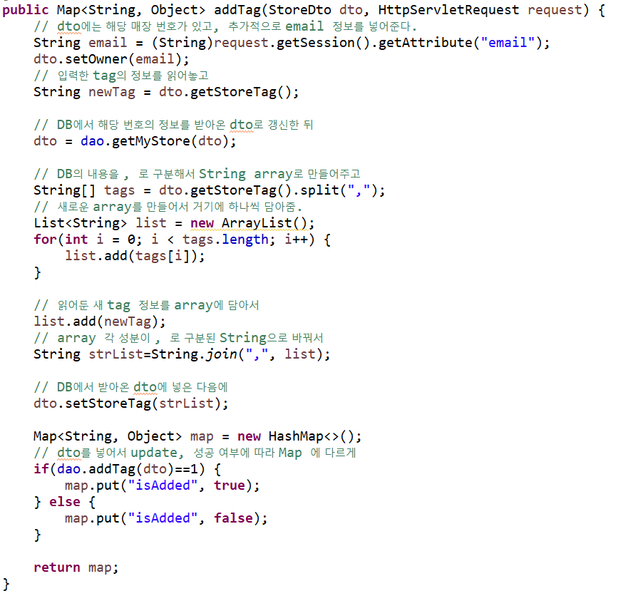 매장에 대한 tag 추가 요청에 대한 controller의 method이다. 역시나 Map 객체를 만들고 값을 put 하는 과정을 service 단으로 넘기고 싶다.