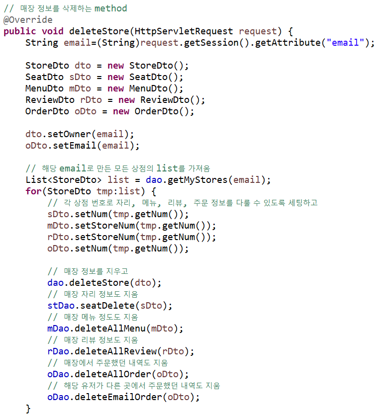 사실 이 부분은 마이 페이지에서 회원 탈퇴하는 UsersController의 method를 확인할 때 다루었다. 하지만 이후에 test를 거치는 과정에서 매장 삭제 과정에서 오류가 발생했다. 오류란, 매장과 관련된 data는 정상적으로 삭제되었지만, 매장 자체의 data는 삭제되지 않는다는 점이었다. 게다가 하나의 매장 정보만 지우고 싶었는데, 모든 매장에 대한 정보를 지우고 있었다. deleteStore 를 요청했을 때 해당 email 로 된 모든 매장 정보를 불러와서 지우기 때문인데, UsersController 단에서의 반복문 logic을 service 안쪽으로 들여오면서 문제가 발생한 것이다. 때문에 하나의 정보만을 지우고 싶을 때를 함께 고려해서 logic을 수정해야 한다.