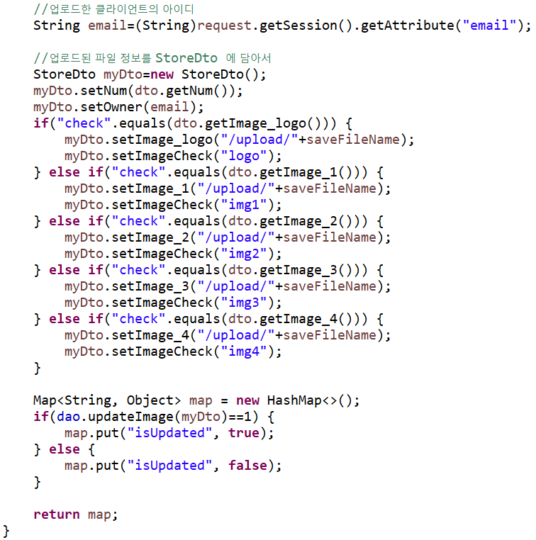 이미지를 upload 하는 logic은 마이 페이지에서 프로필 이미지를 업로드하는 것과 동일하다. 오히려 여기에서 눈길을 끄는 것은 if 문으로 어떤 이미지에 해당하는 것인지 분기해놓은 부분이다. 보면 모두 동일하게 check라는 값을 전달받아 경우의 수를 나눴는데, front 단에서는 해당 name으로 된 값을 check 로 전달하고 있었다. 그리고 해당 내용을 DB의 query 문에서도 경우의 수를 분리해두었다. Logic 자체를 그냥 둔다고 해도 DB에는 imageCheck 라는 column은 사실 필요가 없고, 해당 column에 data를 넣는 과정도 필요가 없다. 그래서 해당 dao method 자체를 지워버렸다. 저런 식으로 분기를 하지 않고 바로 알아서 찾아서 upload 하는 방식은 없을까 하고 고민했는데, 알아서 method를 골라갈 수는 없을 것 같다.