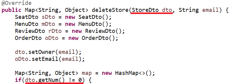 다시 매장 정보 삭제하는 method로 돌아왔다. 지금은 넘겨받은 StoreDto 객체에 number data가 있으면 그 번호에 해당하는 매장 관련 data를 지우는 것이고, 없으면 해당 계정이 관리하고 있는 모든 매장 data를 지우는 logic이다.
