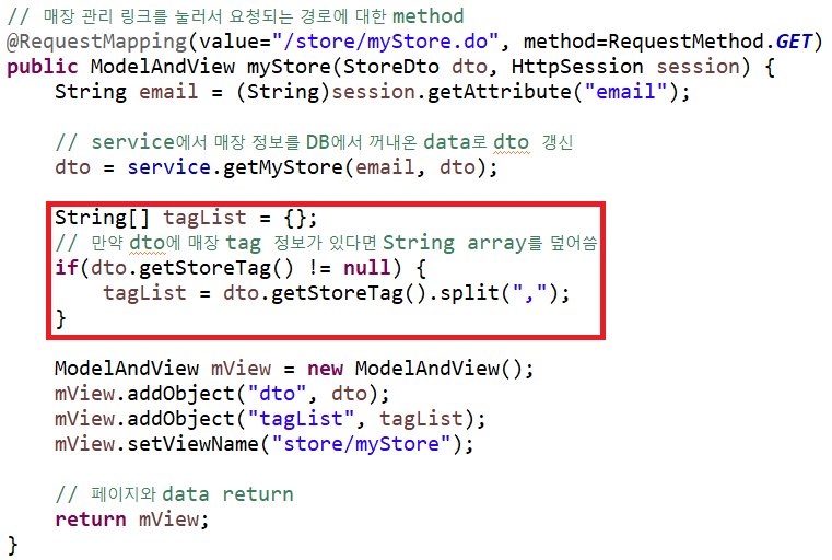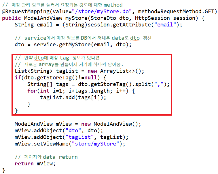 지난 게시글에서 Http 의존성을 제거해준 controller의 myStore method는 매장 관리 페이지로 넘어가는 요청에 대한 처리를 해준다. 해당 과정에서는 tag를 화면에 출력하기 위한 logic이 있는데 이에 대해 살펴보고자 한다.