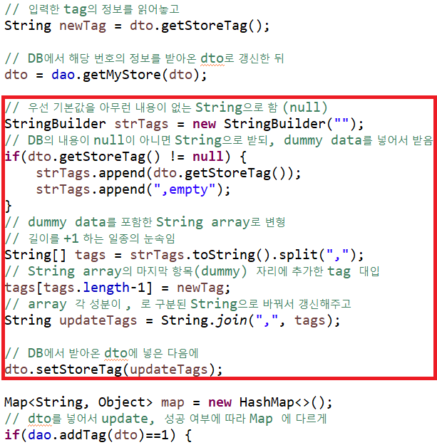 우선 DB에서 받을 내용을 null 이 아닌 아무것도 없는 상태로 초기화했다. 만약 DB에서 받아온 tag 정보가 null이 아니면 해당 data에 ",empty" 를 붙여서 String array로 바꿀 때 눈속임을 할 수 있도록 한다. 그 눈속임을 한 자리에 해당하는 index에 새로운 tag data를 넣어서 다시금 String으로 전환한 후에 DB에 data를 update 하는 방식으로 바꾸었다.