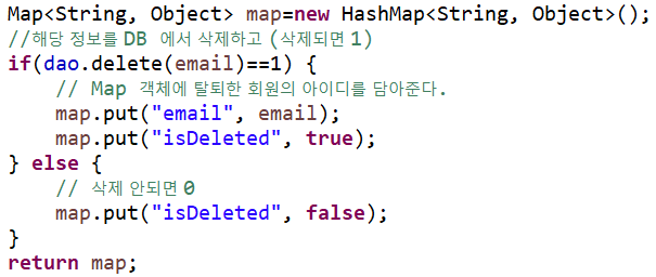처음에는 하나의 method로 만들어서 비슷한 logic을 반복하지 않기 위해 코딩한 방식이었는데, refactoring을 하면서 그 방식이 좋지 않았음을 깨닫고 있다. 하지만 기존에 회원 정보를 삭제하는 dao method를 수행하면서, 수행 여부에 따라 결과를 분기한 부분에서 문제가 발생할 수 있을 것 같다. 예를 들어 회원이 관리하는 모든 매장 정보들을 삭제하였으나 회원의 정보를 삭제하는 과정이 수행되었으나 제대로 지워지지 않을 경우(그럴 경우는 사실 없을 것 같지만), 매장 정보는 지워지고 회원 정보는 지워지지 않을 수도 있지 않을까?