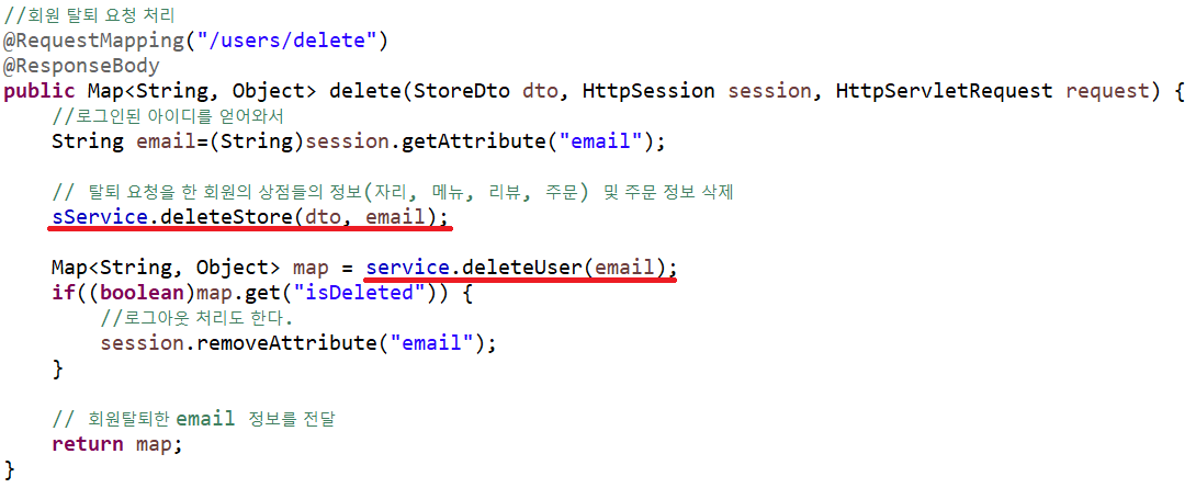 우선 매장을 삭제하는 logic으로 돌아오면 결국 하나의 service logic으로 통일해야한다는 것이다. 그래서 StoreService의 delete method에 분기해놓은 내용을 UsersSerivice의 deleteUser method로 옮기고, UsersController에서는 StoreService의 deleteStore method를 호출하지 않도록 수정했다.
