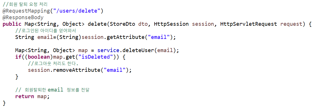 다시 이전 내용들을 확인해보면 UsersController에서는 이 회원 정보를 삭제하는 delete method 이외에도 마이 페이지로 이동하는 info method에서, StoreController에서는 검색 메인 페이지로 이동하는 main method와 매장 상세 정보 페이지로 이동하는 goStoreDetail method에서 여러 개의 service logic을 사용하고 있다. 이번 게시글에서는 매장을 삭제하는 logic만 수정하고 나머지 내용들을 다음 게시글에서 수정해야겠다.
