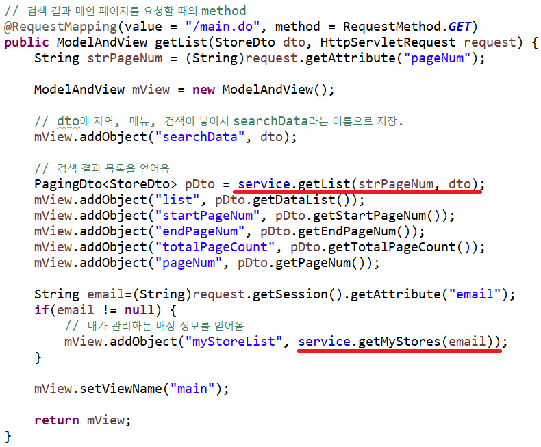 지난 게시글에서 StoreService의 deleteStore에 대한 logic을 고민하면서 분기했던 logic을 UsersService의 deleteUser에 옮겨서 하나의 service logic으로 만들어서 UsersController의 delete method에서 하나의 service logic만을 호출하도록 바꾸었다. 이번 게시글에서는 그 나머지 마이 페이지 이동에 대한 호출인 UsersController의 info, StoreController의 검색 메인 페이지 호출에 대한 main과 매장 상세 정보 페이지 호출에 대한 goStoreDetail 에서는 어떤지를 살펴보려고 한다.