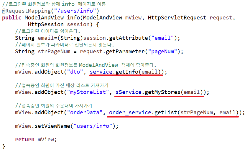 UsersController의 info method에서는 접속중인 회원의 정보, 회원이 관리하는 매장 list, 회원이 주문한 내역에 대한 정보와 paging 처리에 필요한 정보를 request scope를 통해 front로 넘기고 있다. 그리고 해당 정보들을 각각의 service logic을 통해 넘기고 있다.