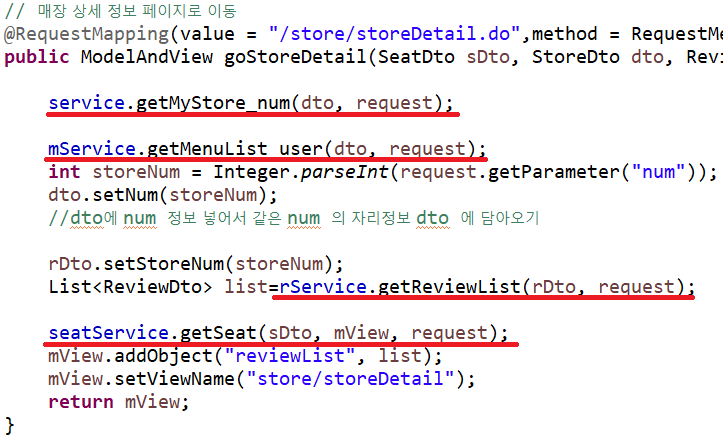 메인 페이지에서 매장 상세 정보 페이지 요청에 대한 goStoreDetail method도 마찬가지로 단순히 DB의 data를 얻어오는 logic 뿐이다. 따라서 service logic을 하나로 만들지 않기로 하며, 다른 내용과 다르게 아직 Http 의존성이 남아있는 이유는, 매장 상세 정보 페이지 관련 내용을 따로 게시글로 다루기 위함이다.