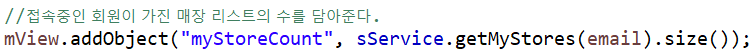 첫 번째는 StoreService의 getMyStores method를 사용해서 넘기는 data는 접속한 회원이 가진 매장의 List 정보인데, front에서는 그 List data가 아닌 List의 size 값만을 사용하고 있었다. 그러면 List 전체의 data보다 List의 size 값만을 넘겨준다면 보다 더 효율적이라고 생각해서 해당 부분을 바꿔주면서, front에서 다른 이름으로 받을 수 있도록 수정해주었다.