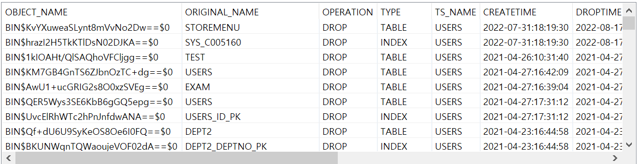 그렇다면 data 말고 table도 복구할 수 있지 않을까? Oracle 10g 버전 이후부터는 recyclebin 이라는 휴지통 개념의 친구를 제공한다고 한다.