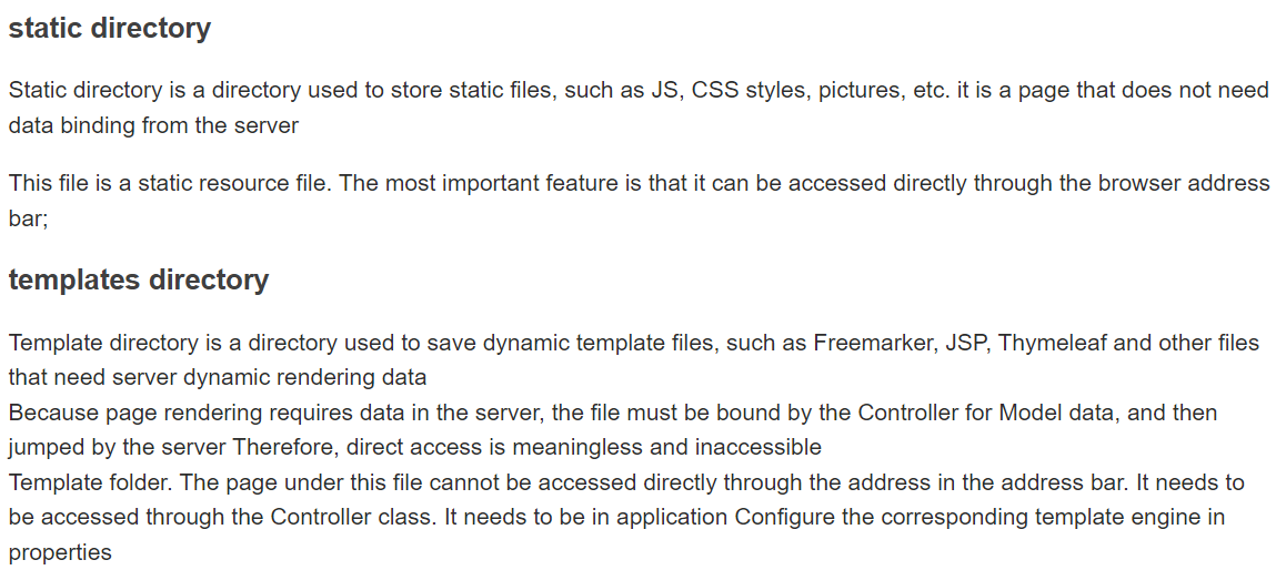 static directory는 js, css, 사진 등의 static(정적) file을 저장할 때 사용하는 directory이다. Server로부터의 data binding이 필요하지 않은 페이지도 이곳에 포함될 수 있다.