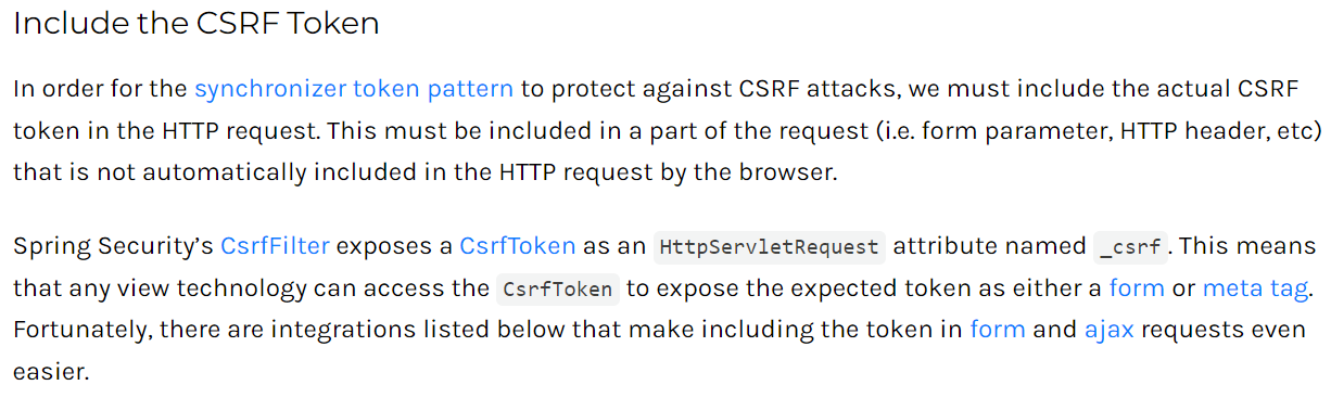 Docs에는 CSRF 공격에 방어하기 위해서 HTTP request에 CSRF token을 반드시 포함시켜야한다고 적혀있다. 이때 form 안쪽에 parameter로 전달해야 하거나 HTTP header에 포함시키는 등, browser가 자동으로 해주지 않는 영역에 대해 token을 포함시킬 수 있도록 해야 한다.