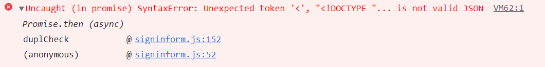 현재는 javascript를 통해서 validation check를 한다. (당장은 이렇지만 회원 가입과 로그인 기능에 대한 작업을 마무리하고서 다시 valiation을 back 단에서 하는 방식으로 수정해볼 생각이다.) 그리고 입력한 정보에 대한 validation 과정에서 Fetch를 통해 Post 방식으로 ajax request를 보낸다. 문제는 이곳에서 발생했다. 기존에는 csrf가 disabled 되어서 data를 server로 보내는 것에 문제가 없었지만, 해당 내용을 지우고서 작업하니 browser 다음과 같은 메시지를 확인하게 되었다.