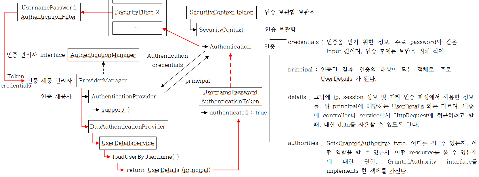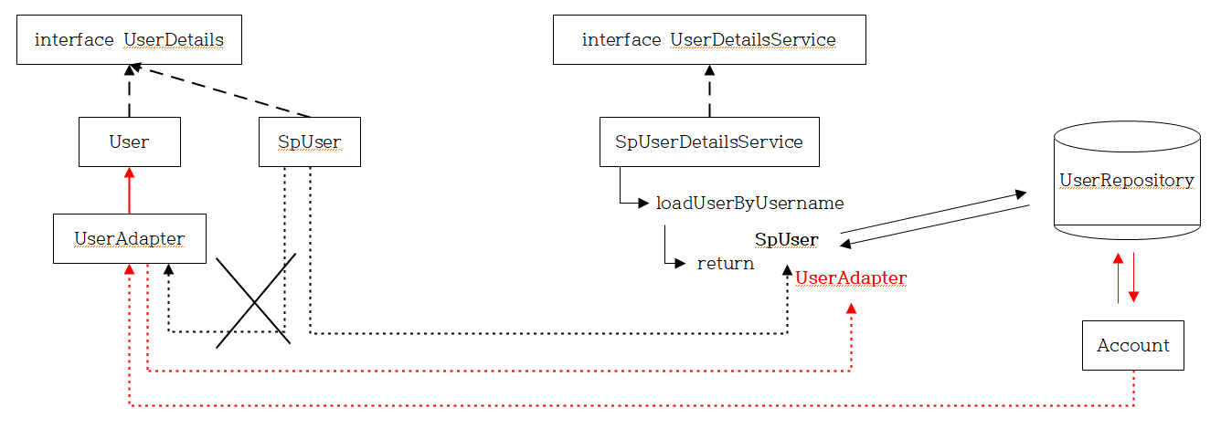 나름대로 이해해보기 위해서 그림을 그려보았다. 검정색은 기존 필자의 작업, 붉은색은 찾아낸 블로그의 작업을 표기했다. 먼저 블로그의 내용부터 이해해보겠다. UserRepository와 data를 주고 받는 Account Entity가 있다. 이때 로그인 과정의 loadUserByUsername method에서 Account 자체를 return 하기 위해서는 method의 return type이 UserDetails이기 때문에 Account가 UserDetails interface를 implements 한 것이어야만 한다. 하지만 이렇게 된다면 Account는 UserRepository와 data를 주고 받는 역할에 더하여 로그인 과정에서 UserDetails의 역할도 수행하게 되는 것이다. 필자의 작업이 딱 그 모양새이다.