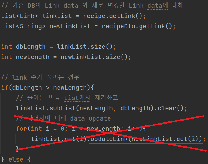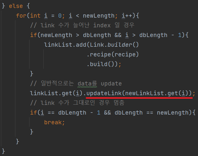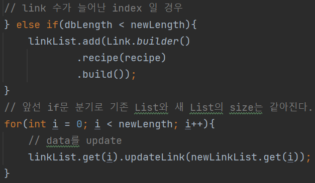 조금 더 줄이자면 참고 링크의 수가 줄었을 때, List<Link> 에서 항목을 지운 순간 data의 수가 그대로인 것과 동일하기 때문에 if문 안쪽의 for문을 지우면서 분기했던 if문을 독립시키고 for문은 통합할 수 있다.