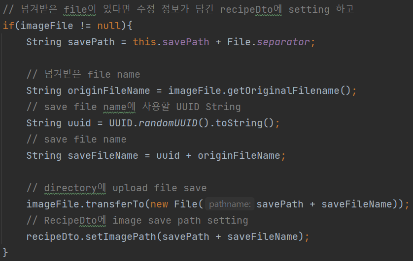 // 넘겨받은 file이 있다면 수정 정보가 담긴 recipeDto에 setting 하고