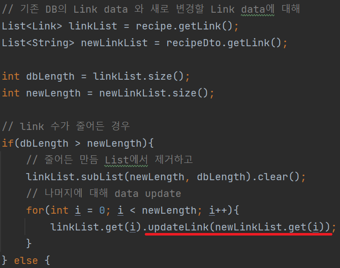 기존에 List<Link> 만을 update 해주던 method를 지우고, client의 update form으로부터 넘겨받은 Recipe Dto와 수정된 List<Link> 를 인자로 받아서 Recipe Entity의 field 값을 수정해주는 method를 만들었다. Image path의 경우는 client로부터 전달받은 data가 null이 아니어서 Recipe Dto에 data가 있을 때만 update 하도록 했다.