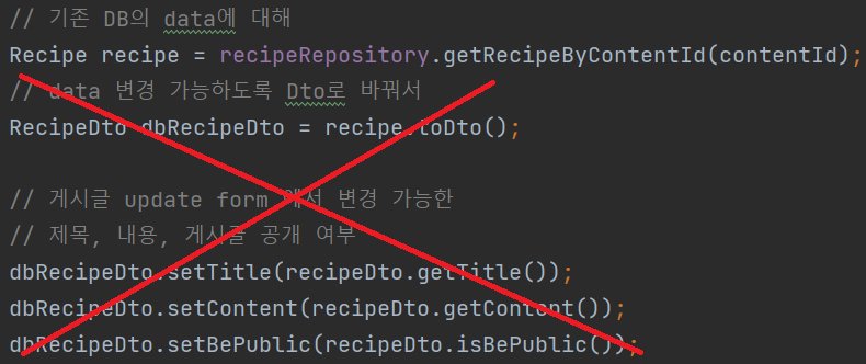 recipe.updateRecipe(recipeDto.getTitle(), recipeDto.getContent(),