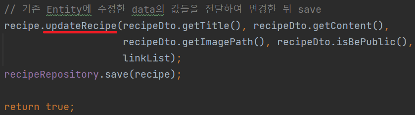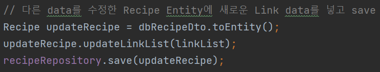 코드에 대한 이미지를 쭉 나열했다. 왼쪽은 Entity의 field를 변경하는 method를 생성하기 전, 오른쪽은 그 후이며 하나만 있는 것은 그대로인 부분이다. 비교해보면 알겠지만 그렇게 큰 변화는 아니다. 괜히 Link Entity에 mapping 된 DB로부터의 data를 잃으면서까지 Recipe Entity를 Dto로 변환하고, 일부 data를 수정하고서 다시 Entity로 변환한 뒤 온전하지 않은 List<Link> 는 따로 다시 setting 하는 과정이 간결해진 것이 전부이다.