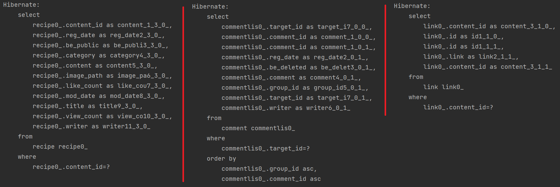 실제로 동작하는 query문의 순서이다. 우선 recipe table에서 data를 select하고, Recipe Entity와 연관 관계가 있는 comment, link table에서도 data를 select 한다.