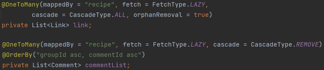 왼쪽 이미지는 Recipe, 오른쪽 이미지에서 위쪽은 Link이고 아래쪽은 Comment 이다. 중요 point는 Recipe Entity에 작성된 cascade 속성이다. Cascade Type ALL 에도 포함되어 있는 REMOVE 옵션은 해당 Recipe의 data가 지워지면, 그와 연관된 Entity에 해당하는 data도 지워주는 역할을 한다.